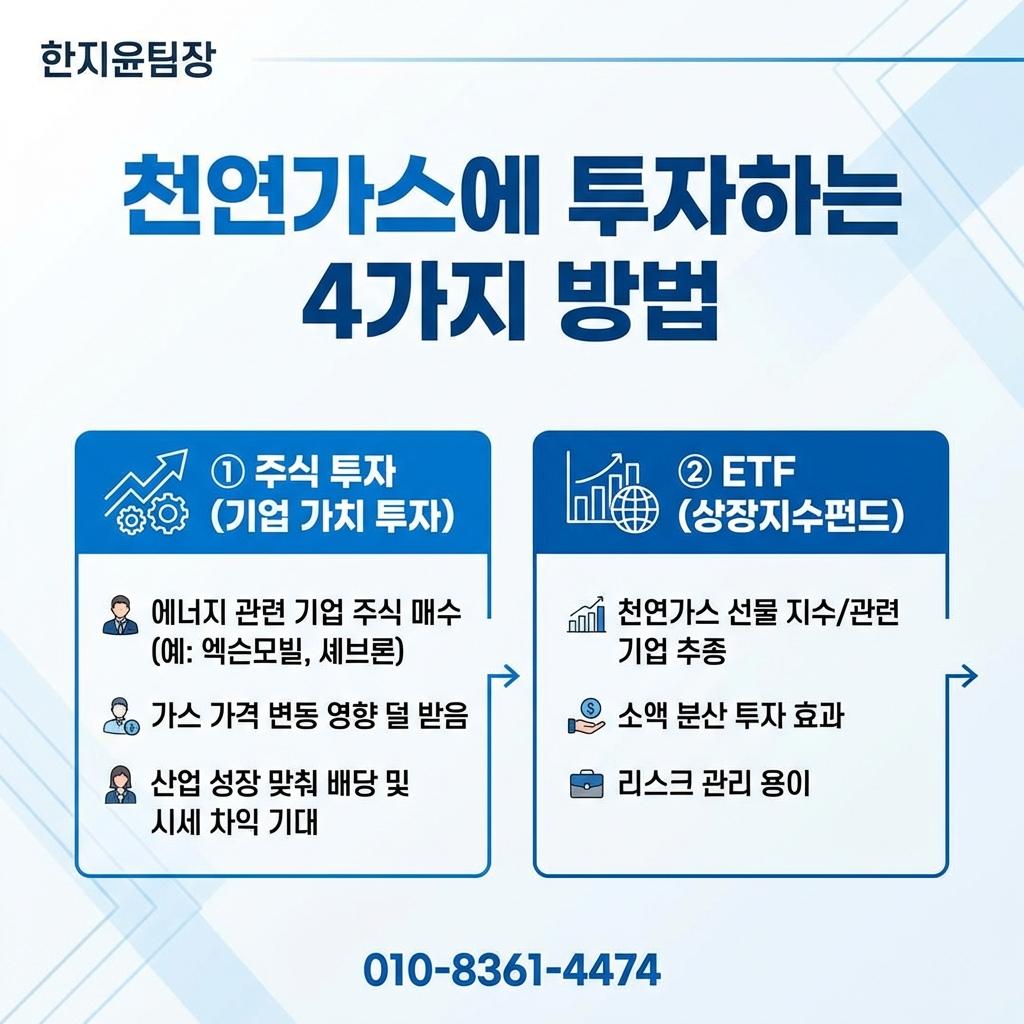 천연가스 선물 지수나 관련 기업들을 추종하는 ETF에 투자하는 방식입니다. 적은 금액으로도 여러 기업에 분산 투자하는 효과를 누릴 수 있어 리스크 관리에 용이합니다.