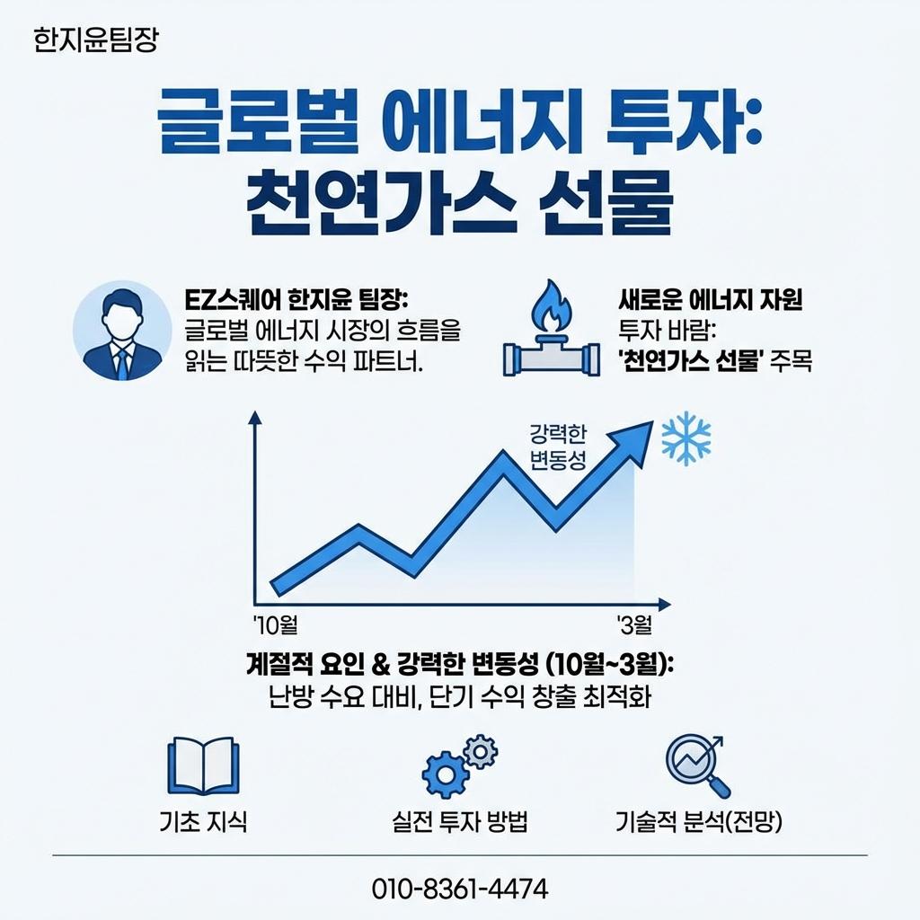 최근 금융 시장에는 '새로운 에너지 자원'에 투자하는 거센 바람이 불어오고 있습니다. 특히 에너지 종목은 계절적 요인을 아주 강하게 타는데요. 보통 여름이 지나가기 전 미리 겨울의 난방 수요를 대비하는 현명한 투자자들이 반드시 포트폴리오에 담는 종목이 있습니다. 바로 '천연가스(Natural Gas) 선물'이죠.